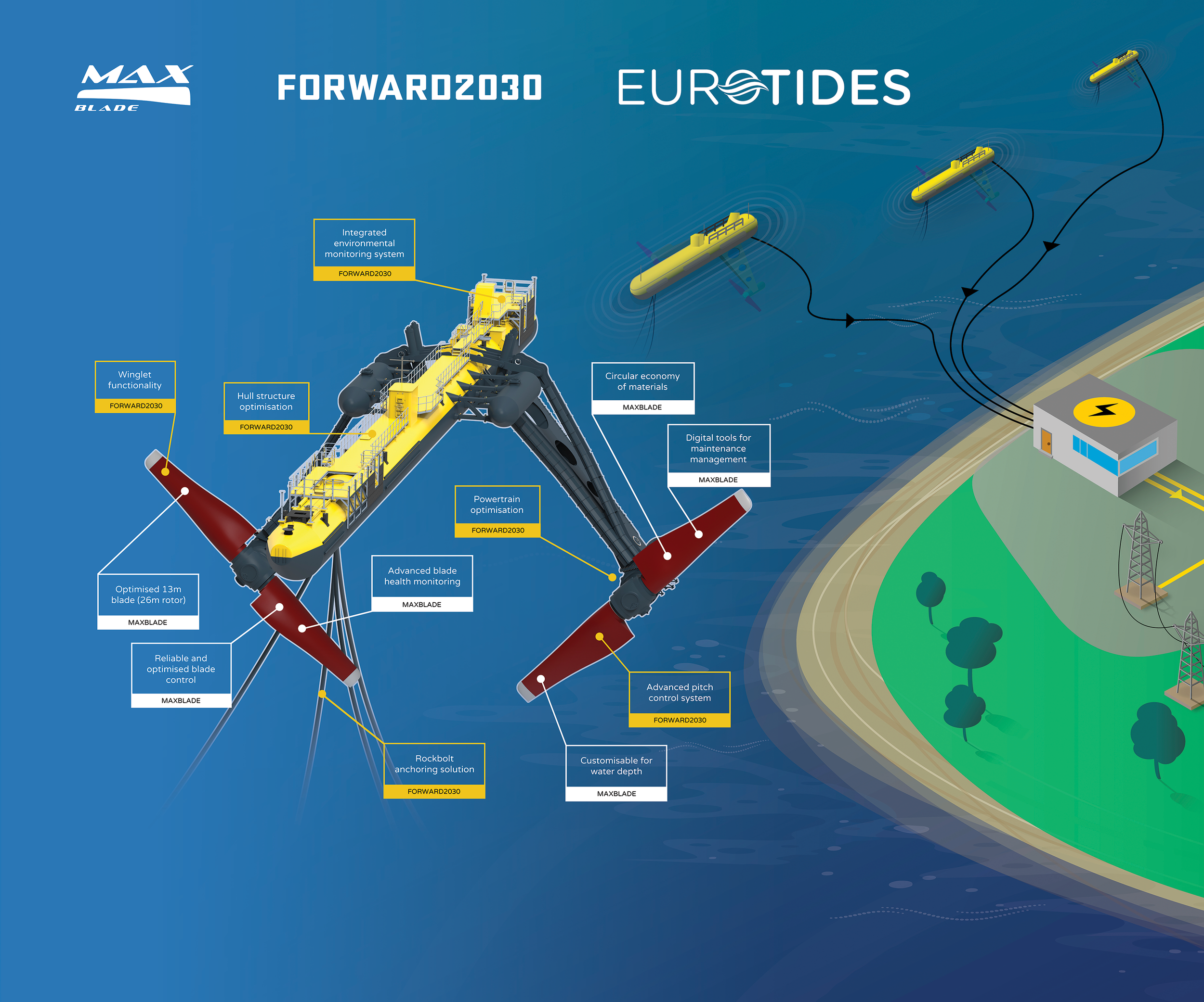 To ensure reduced cost of future tidal stream farms, EURO-TIDES will develop two distinct innovative balance of plant systems, one for electrical infrastructure and one for farm level anchoring. This will draw on the single device incremental innovation developed in FORWARD-2030 (notably subsea connector and rockbolt anchors) and consider the installation of multiple turbines at a single location.